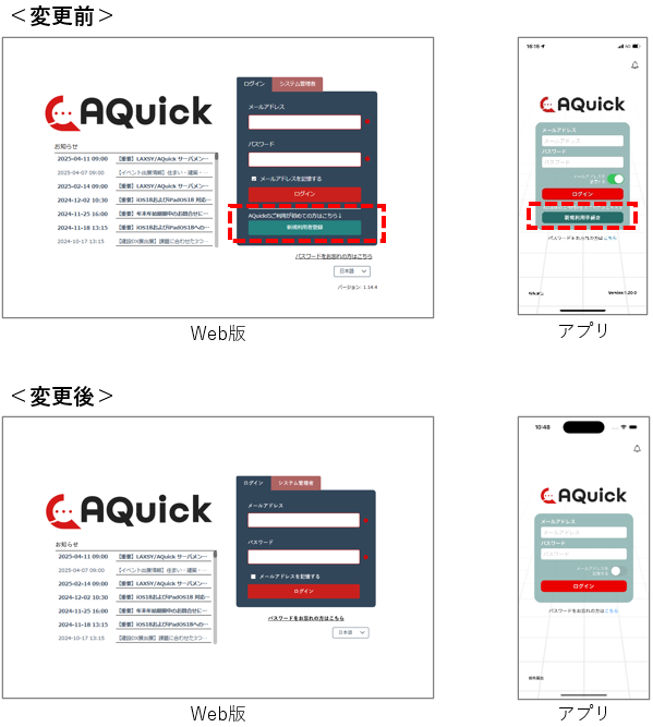「新規利用登録ボタン」を廃止いたします(赤破線部分)。
