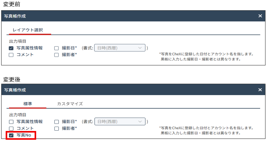 帳票レイアウトに「写真No」のチェックボックスを追加しました。