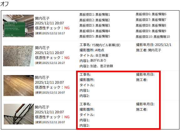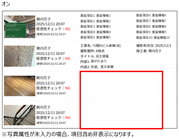Web版でもiOS版と同様に写真一覧に黒板情報や写真情報が表示されます。