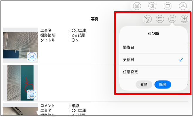 「撮影日」「更新日」ボタンをクリックすることで、