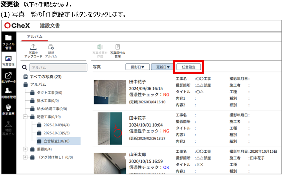 写真一覧の上部に「撮影日」「更新日」「任意設定」ボタンを追加しました。