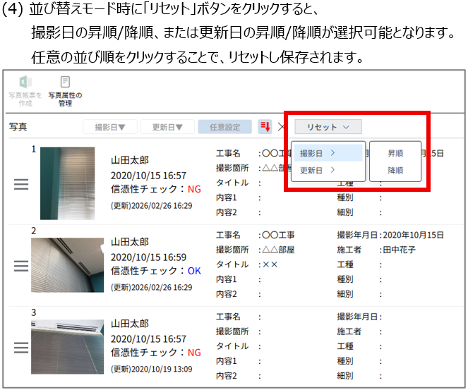 撮影日昇順・撮影日降順・更新日昇順・更新日降順のいずれかの状態にリセット可能です。