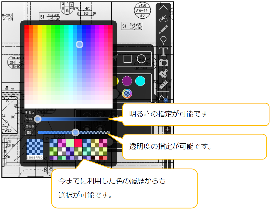 (1)メモ機能で自由に色と透明度が選択可能になりました。
