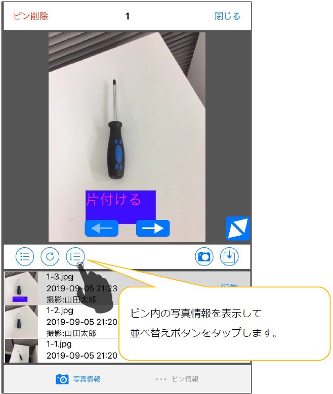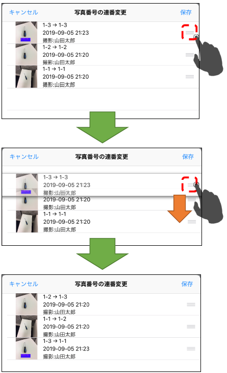 右側のアイコンを上下にスワイプすることにより写真の順番が変更可能です。
