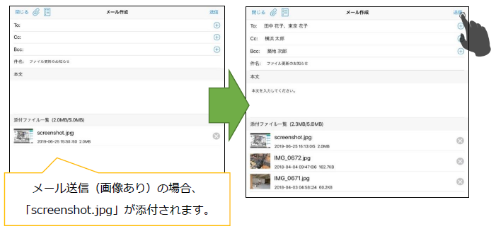 宛先・件名・本文・添付ファイルを入力、選択し、「送信」をタップするとメールが送信されます。