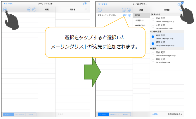 新規メーリングリストに追加したいユーザを選択し、送信アイコンをタップするとサーバにメーリングリストが送信されます。