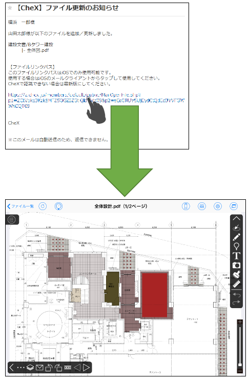 送信されたメールのリンクをタップすると該当のCheXのファイルまたはフォルダ画面に遷移します。