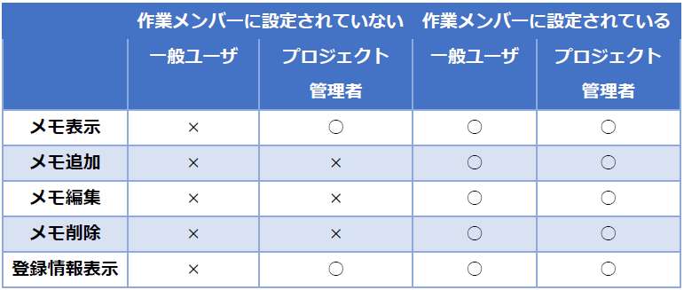 ・測定用手書きメモの追加等の操作権限は、測定帳票の権限に準じます。