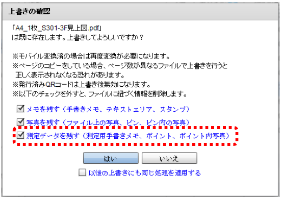 ・同名ファイルを上書きアップロードする際に「測定データを残す」のチェックを外していた場合、測定用手書きメモは削除されます。