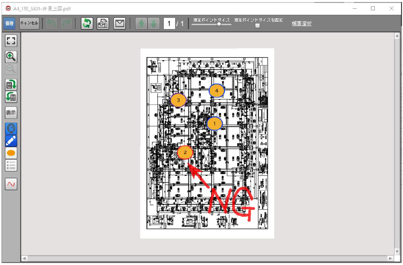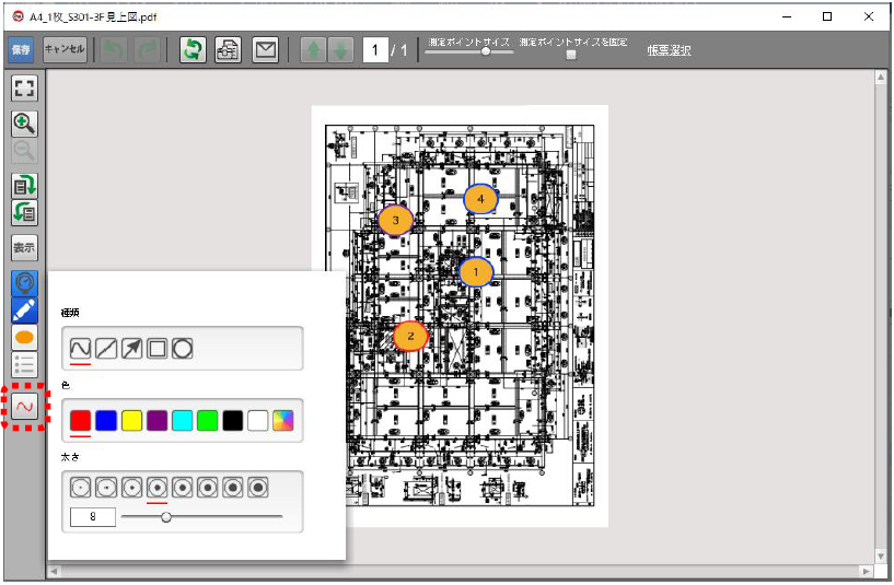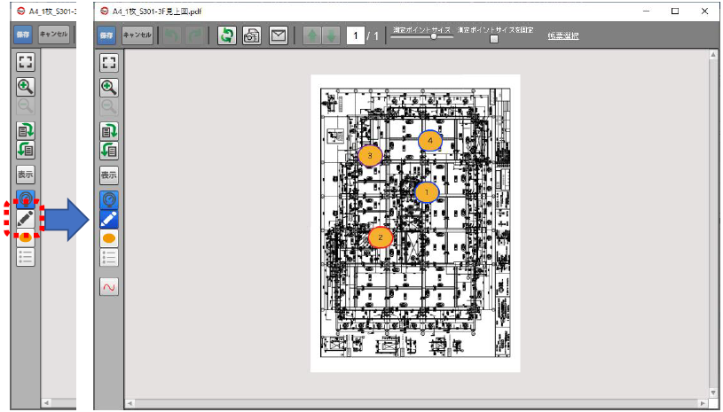 任意のファイルを開き、帳票モードに切り替え、鉛筆のアイコンをクリックすることで、測定用手書きメモモードに切り替わります。