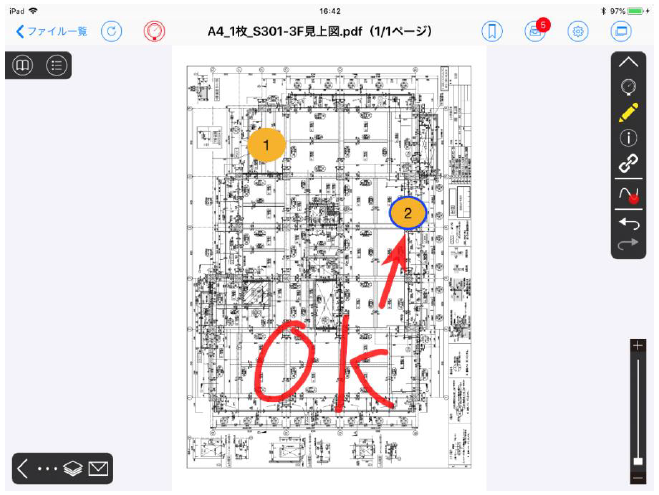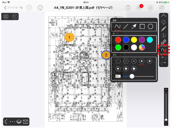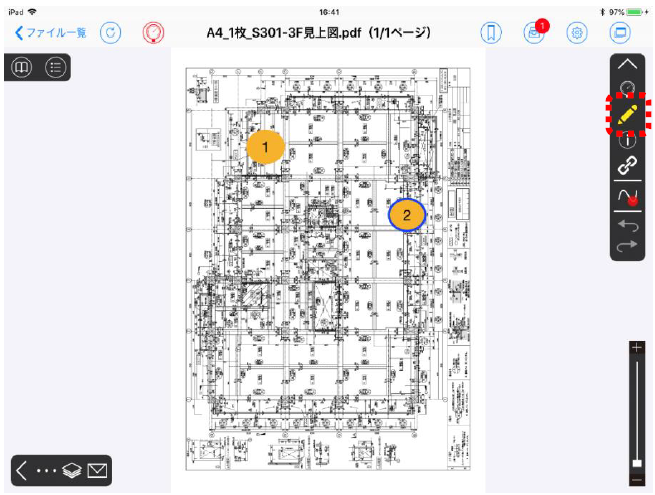 任意のファイルを開き、帳票モードに切り替え、鉛筆のアイコンをタップすることで、測定用手書きメモモードに切り替わります。