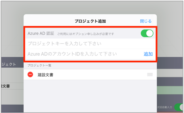 プロジェクトキーとAzure ADのアカウントIDを入力し、追加ボタンをタップします。