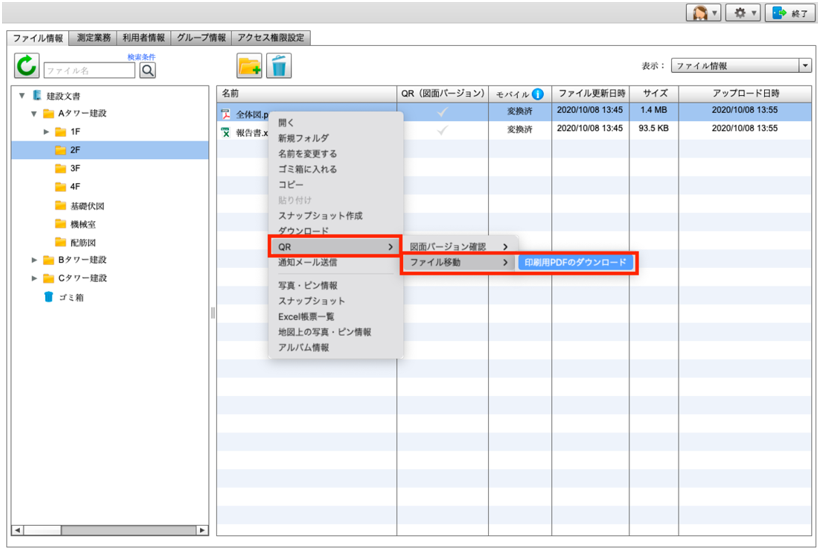 PCからファイルを選択し、右クリックメニューから印刷用PDFのダウンロードをしてください。
