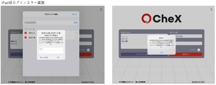 iOS Ver3.22.0 / PC Ver2.35.0を含む旧バージョンでは、AAD多要素認証に対応していないためログイン時にエラーが発生いたします。
