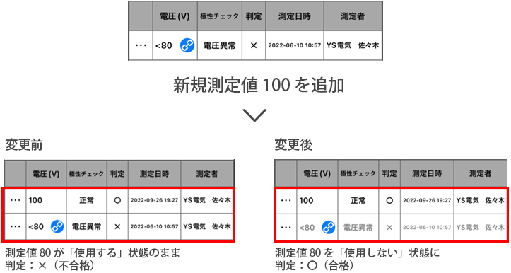 これにより、「…」から「使用する」「使用しない」の状態を変更しなくても、新規測定後すぐに再度合否判定に反映されるようになりました。