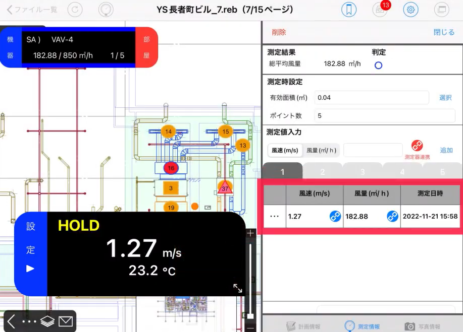 ルート検査モード中も風速値が表示されており、HOLDボタンをタップすることでCheXから測定が可能です。