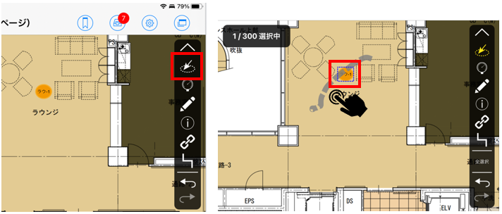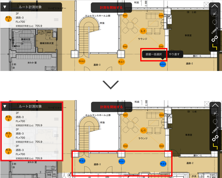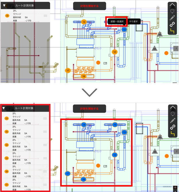測定ポイントをなぞった後に表示される「部屋一括選択」をタップすると、計画値の「階」と「室名・場所」が同じ測定ポイントを、選択した測定ポイントに近い順で自動選択します。