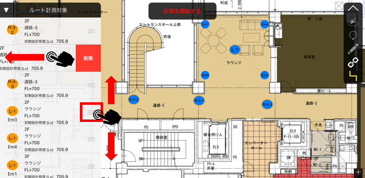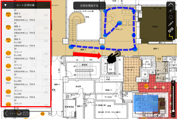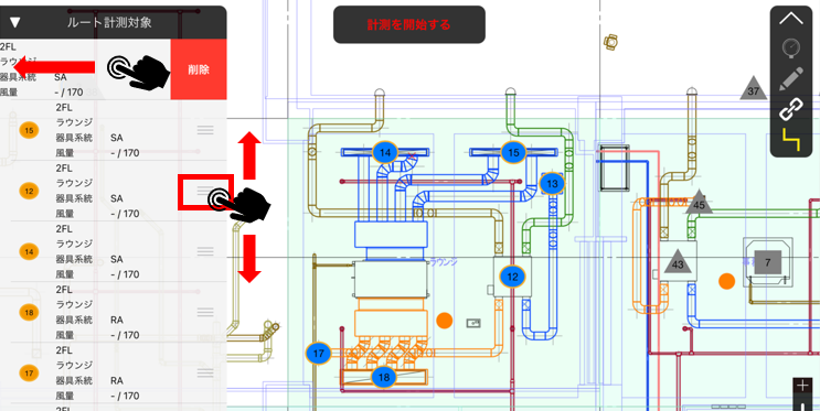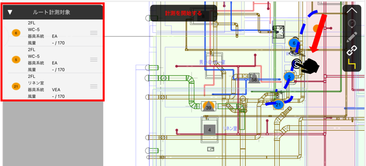測定する順番に測定ポイントをなぞります。なぞった測定ポイントは青色になり、左側の「ルート計測対象」に順番に登録されます。