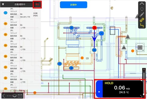 測定ポイントの自動切り替えは左上の停止ボタンから停止可能です。
