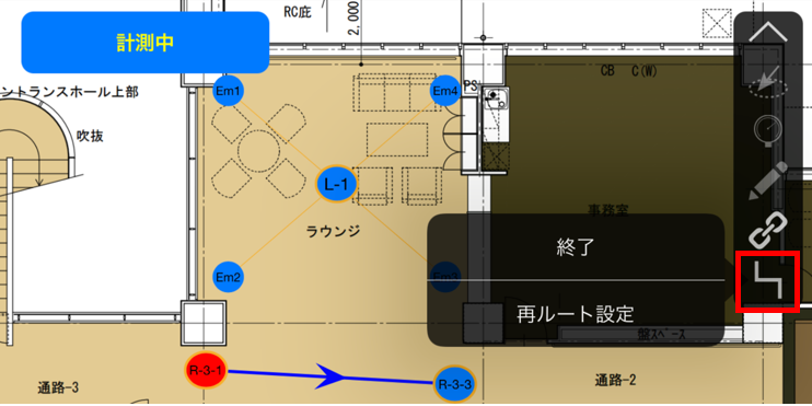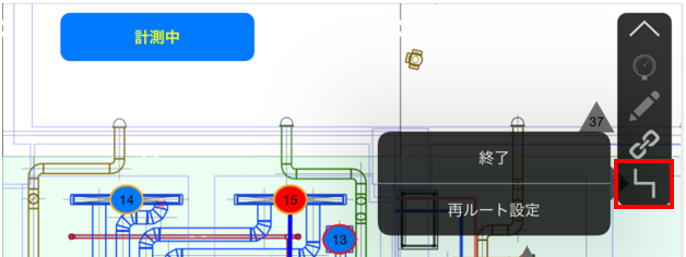 ルート検査ボタンをタップすると、終了/再ルート設定のメニューが表示されます。