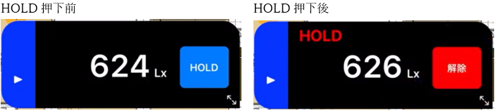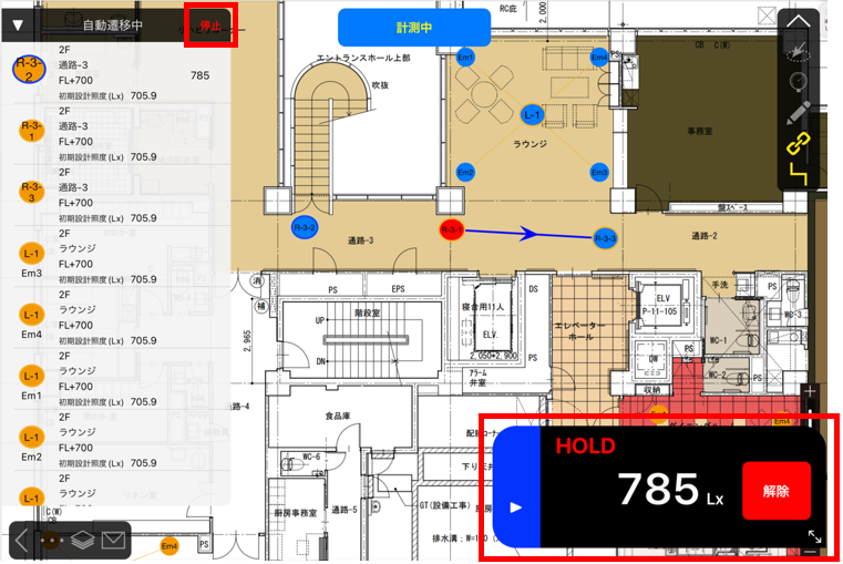 ルート検査モード中も照度値が表示されており、HOLDボタンをタップすることでCheXから測定が可能です。
