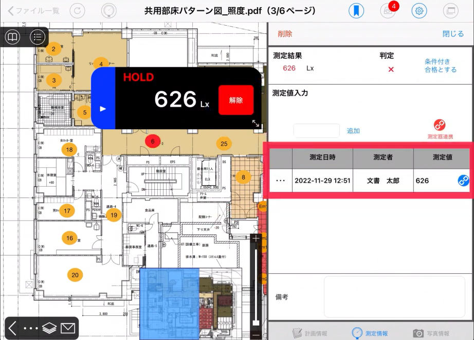 測定すると、ルート設定した順に測定ポイントが自動的に切り替わるので、次の測定ポイントを選び直すことなく連続で測定が行えます。
