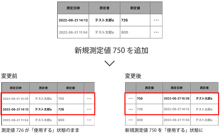 既に「使用する」状態の測定値がある場合、既存測定値は「使用しない」として登録されるよう改善しました。