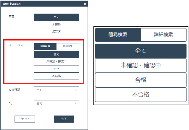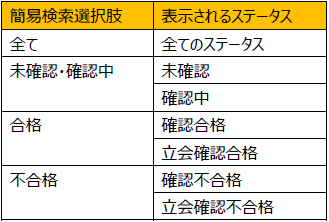 簡易検索の場合、選択肢と絞り込み表示されるステータスは以下のように対応しています。