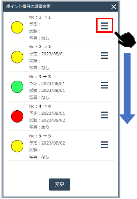 ポイント番号連番変更用画面では、右の三本線のアイコンをドラッグすることで、該当のポイントを入れ替えることが可能 です。
