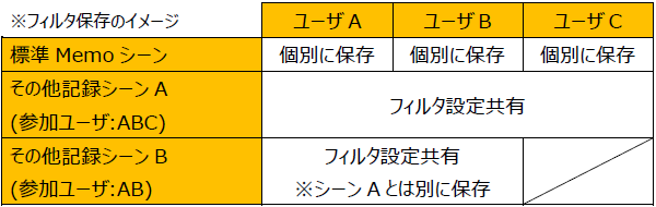 ・標準Memoシーンではユーザごとに個別にフィルタ設定が保存されます。