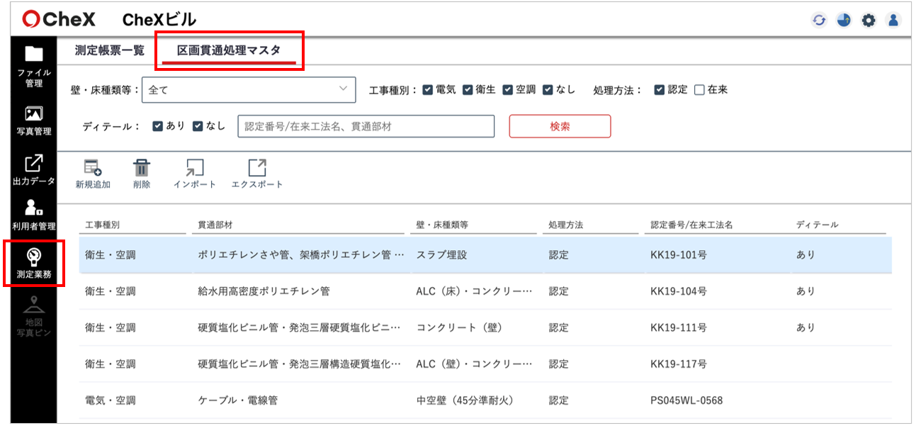 「測定業務」メニューから「区画貫通処理マスタ」タブを選択することでご利用できます。
