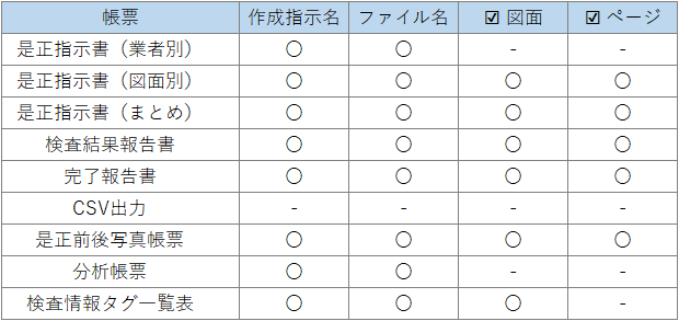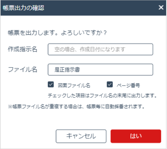 ※「図⾯ファイル名」にチェックを⼊れると、ファイル名の末尾に帳票作成元の図⾯ファイル名が出⼒されます。