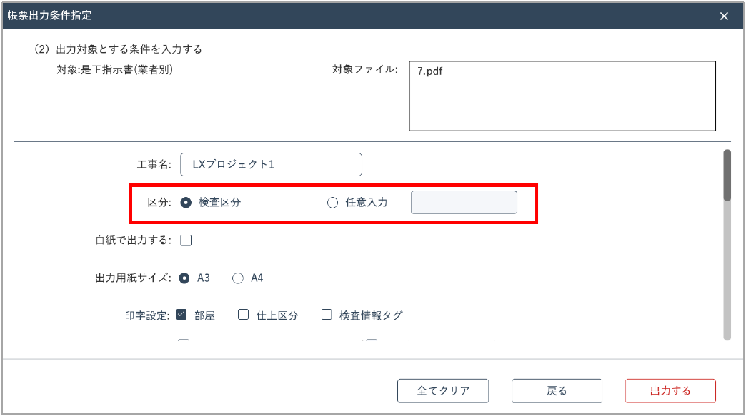 帳票出⼒条件指定の際の区分について、検査区分固定だったものが変更可能になりました。