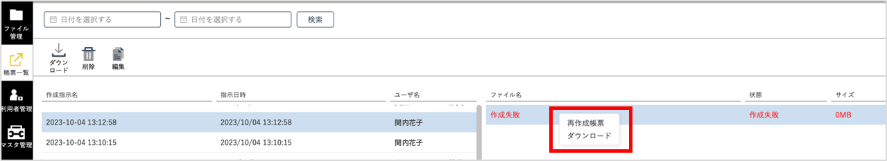 帳票ファイル名一覧で「作成失敗」となった帳票を右クリックすると「再作成帳票」が選択可能です。