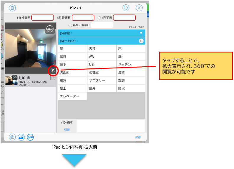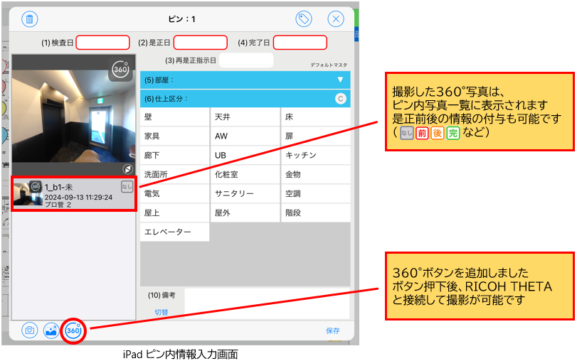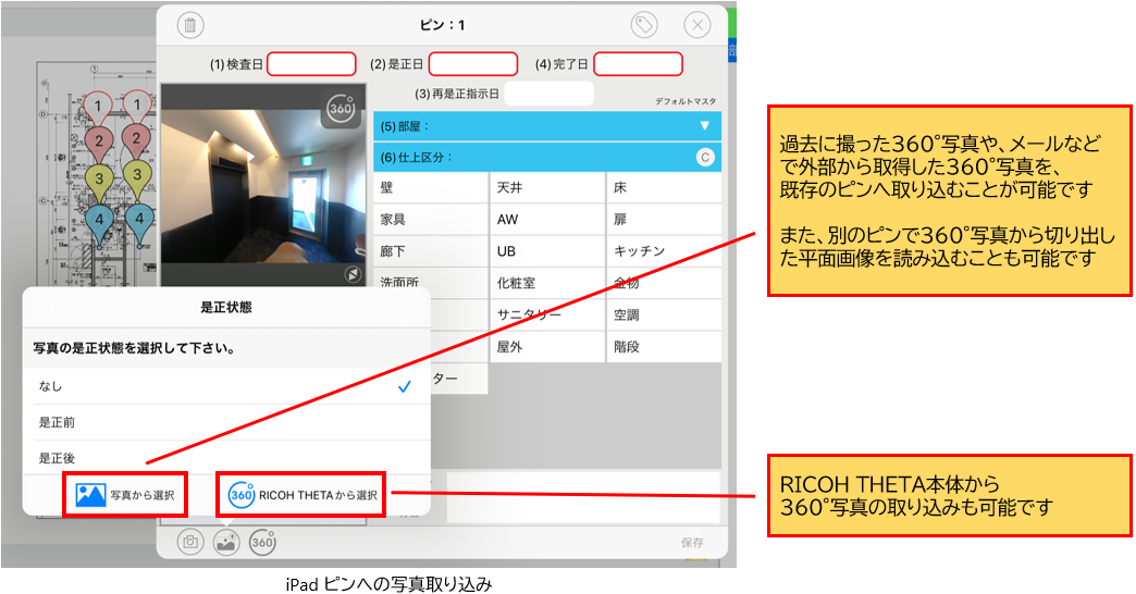 RICOH THETAで撮影した360°写真を、指摘ピンと紐づけて関係者に共有することが可能になります。