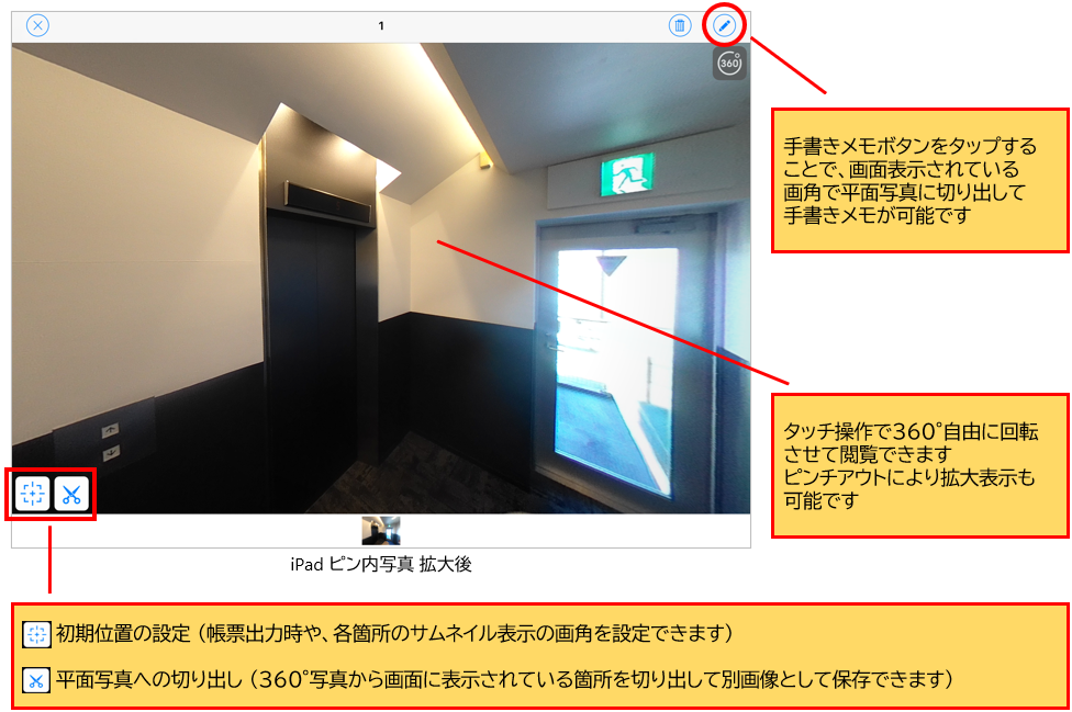拡大表示することで、360°閲覧や画角のロック、平面写真への切り出しが可能です。