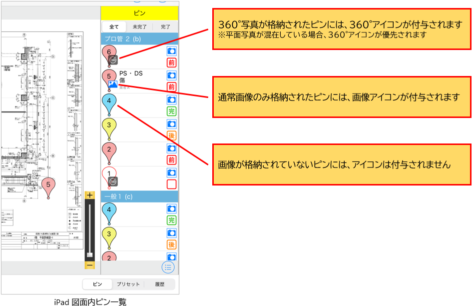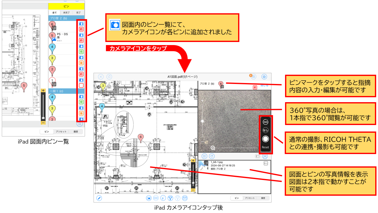 図面内のピン一覧に追加されたカメラアイコンから、図面と写真の並列表示が可能です。