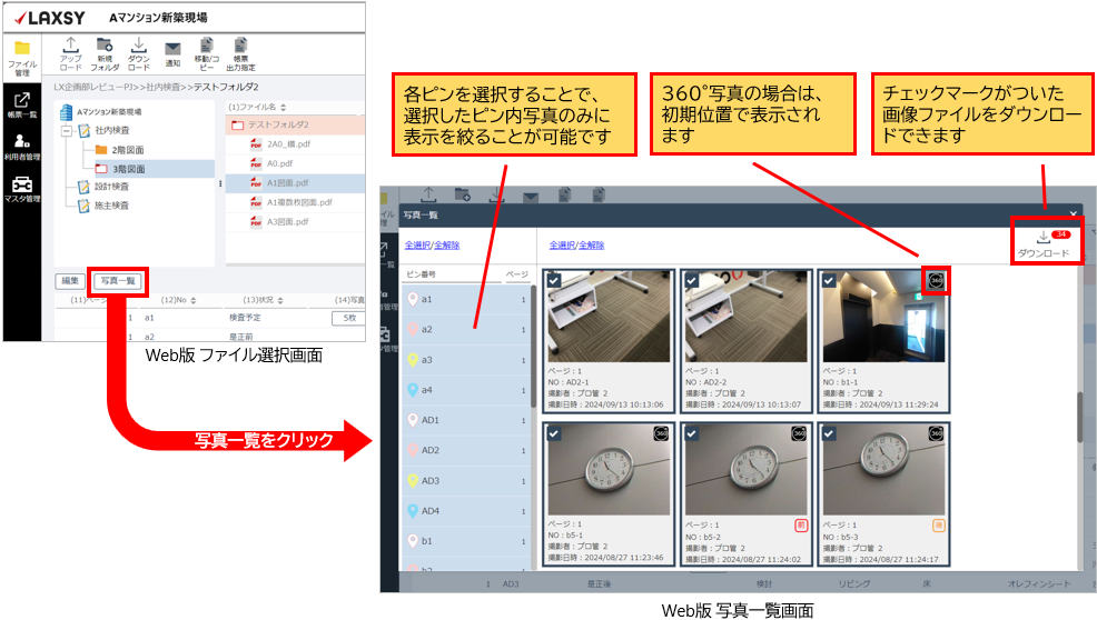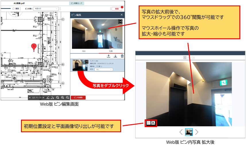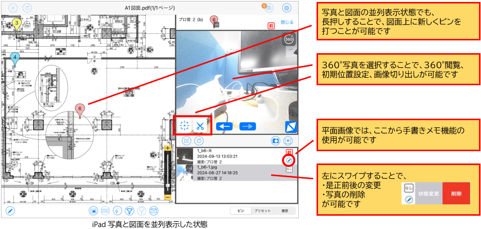 360°写真に限らず、ピンに格納されている画像すべてを図面と並列して表示・閲覧が可能となります。