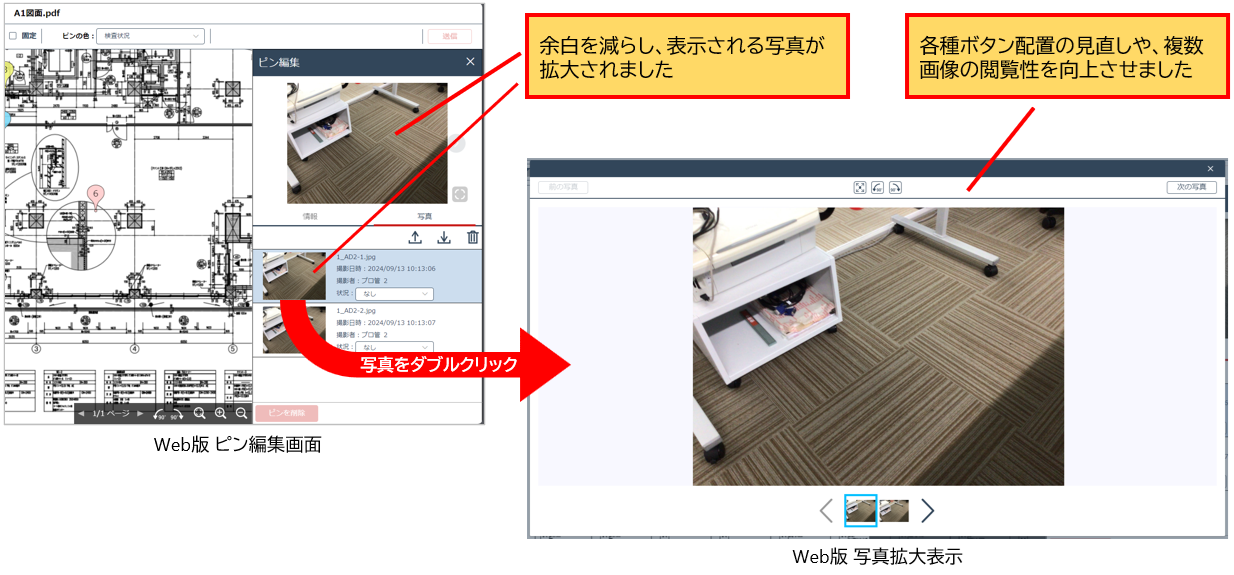 Web版での、①写真一覧表示、②特定ピン内の写真一覧表示、③写真拡大表示時の表示を刷新しました。