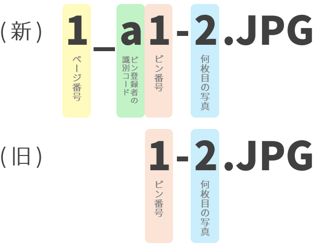 「“ページ番号”_“ピン登録者の識別コード”“ピン番号”-”何枚目の写真”.JPG」の形式にて命名。