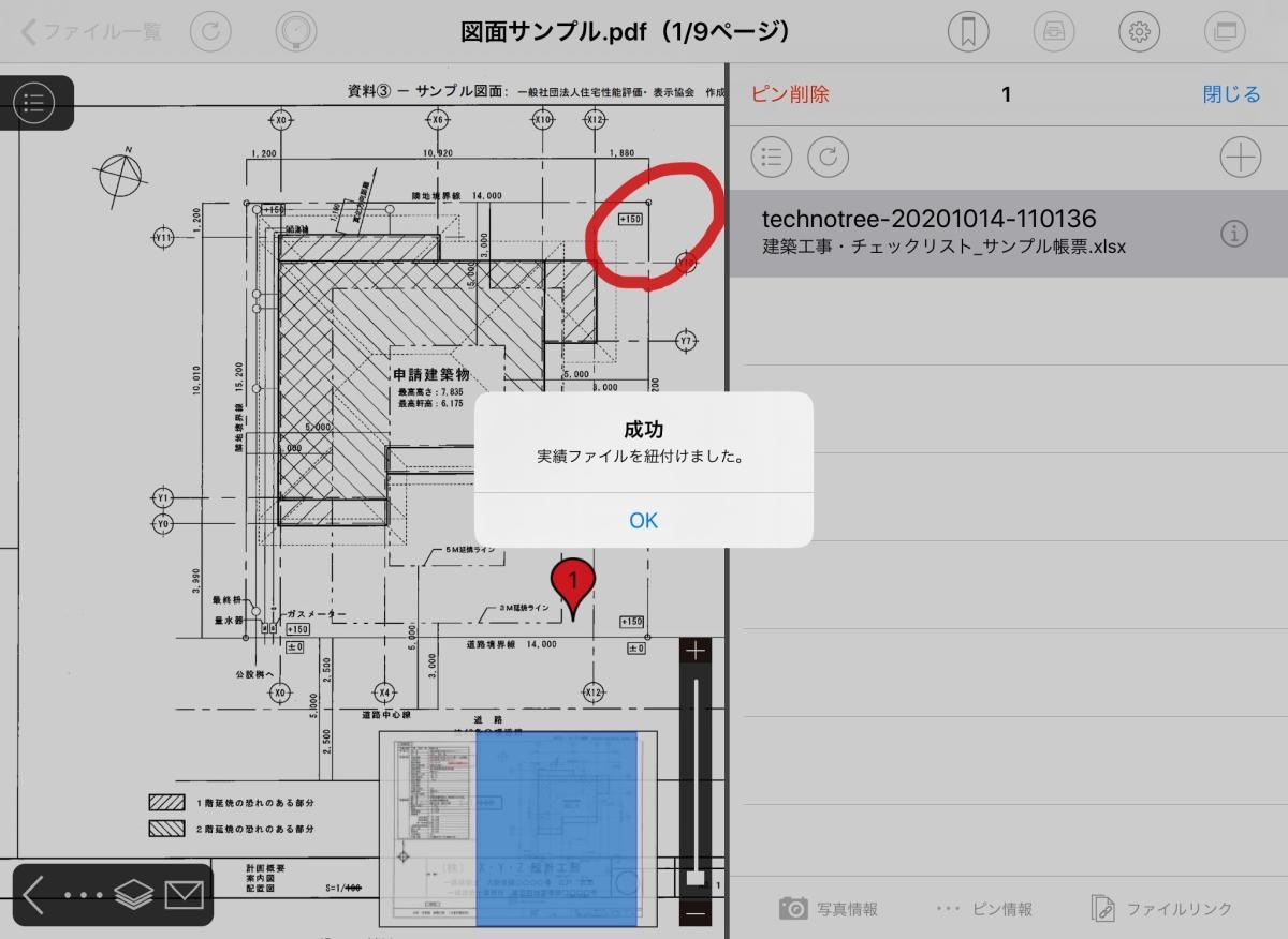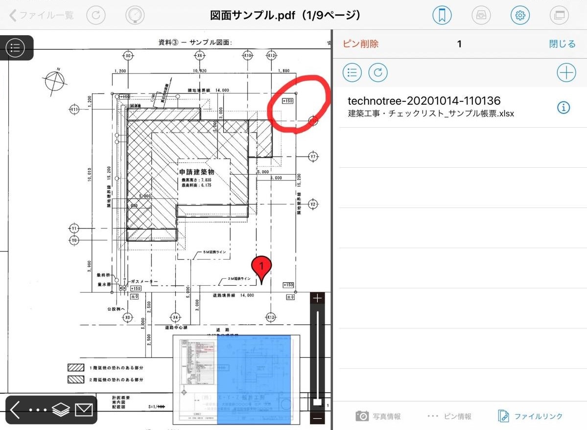 ③帳票入力後、CheXの画面に戻ります。これで図面(ピン)と帳票の紐づけが完了です。